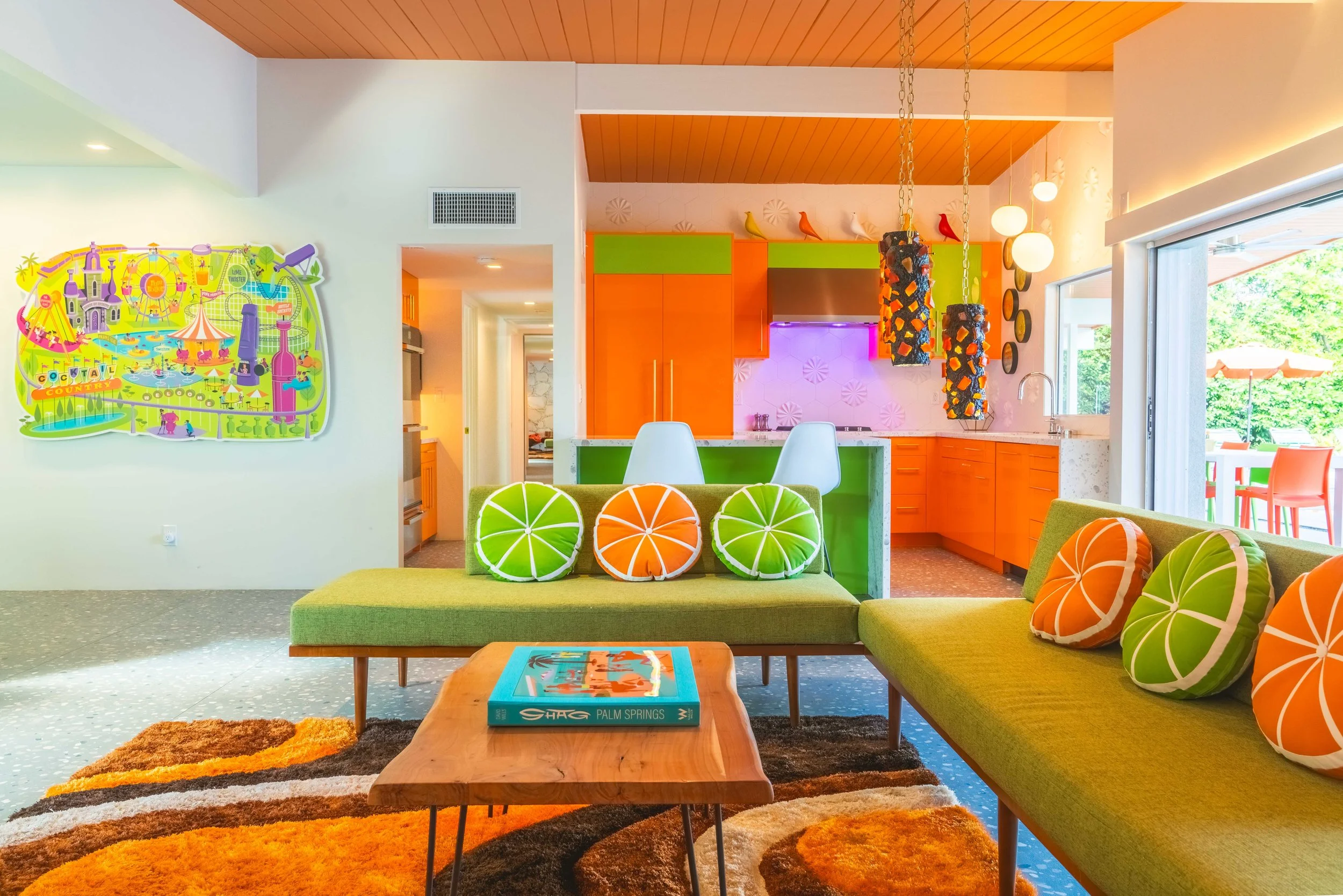 Step into a life-size Shag painting. Each room and outdoor area was personally designed by Shag, featuring bold colors, iconic mid-century furnishings, and an aesthetic that blurs the line between indoors and outdoors.